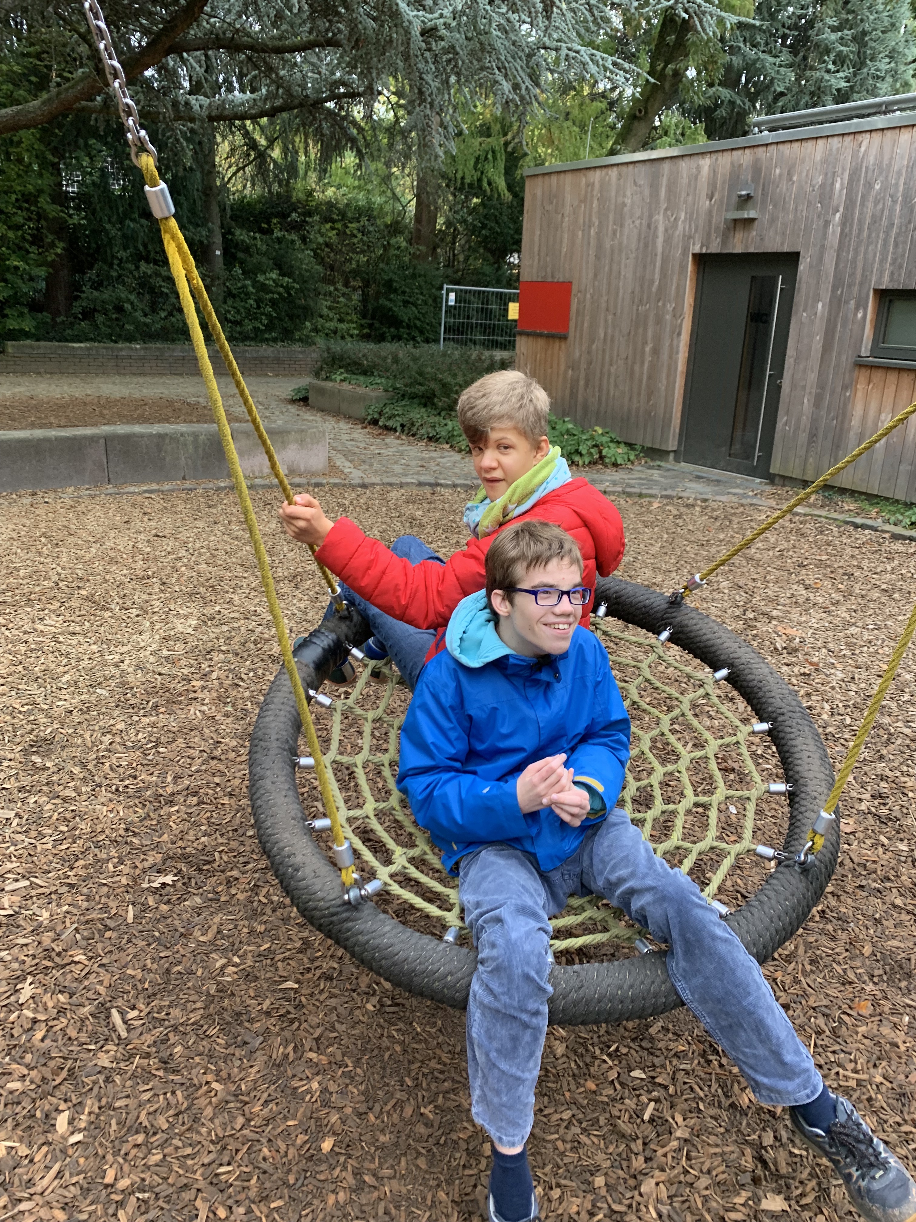Denn unsere Menschen mit Behinderung sind begeisterte Nutzer von Spielplätzen, insbesondere vom Schaukeln können alle gar nicht genug bekommen (auf dem Foto sehen Sie z.B. die begeisterten Schaukler Leo und Julian, die zusammen schaukeln, seit sie zwei und vier Jahre alt sind. Heute sind sie 20 und 22 Jahre alt, aber die Freude am Schaukeln ist geblieben :-)). Aber auch Rolli-Karussells und Angebote mit Sand oder Wasser stehen hoch im Kurs. Viele Spielplätze machen es Menschen mit Behinderung jedoch ganz schön schwer: Rindenmulch auf dem Boden macht das Fahren mit dem Rolli zur Qual, hohe Klettergerüste und Balancierstangen können nicht genutzt werden, die Schaukeln sind für Jugendliche oder junge Erwachsene viel zu niedrig angebracht, die Tische zum Brotzeit machen sind nicht unterfahrbar.